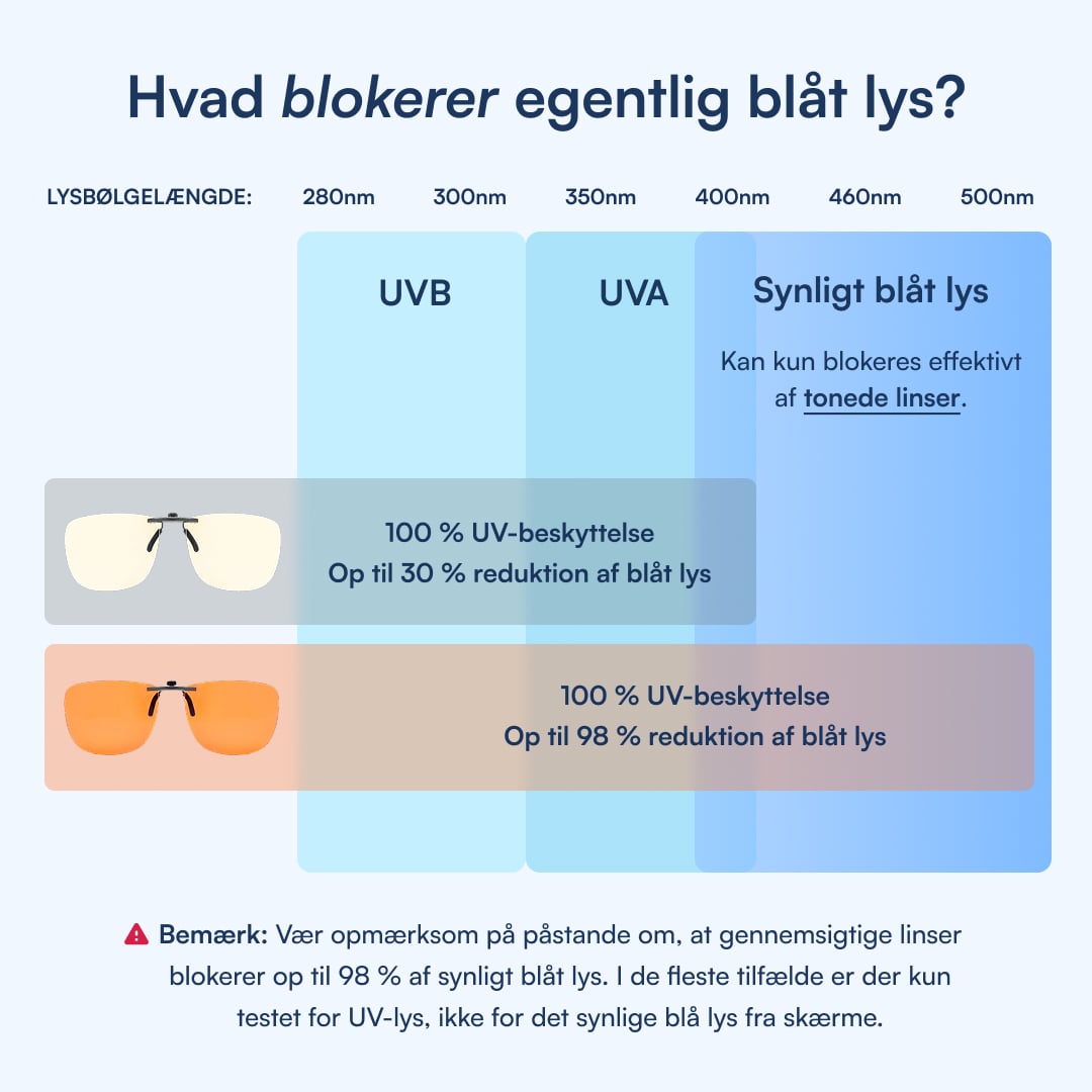 UV-lys er noget andet. Det belaster og kan skade øjnene, og det kan gennemsigtige linser blokere effektivt. Blåt lys fra skærme påvirker derimod kroppens søvnrytme og kan forsinke produktionen af melatonin. At blokere det kræver filtrering af synligt lys.